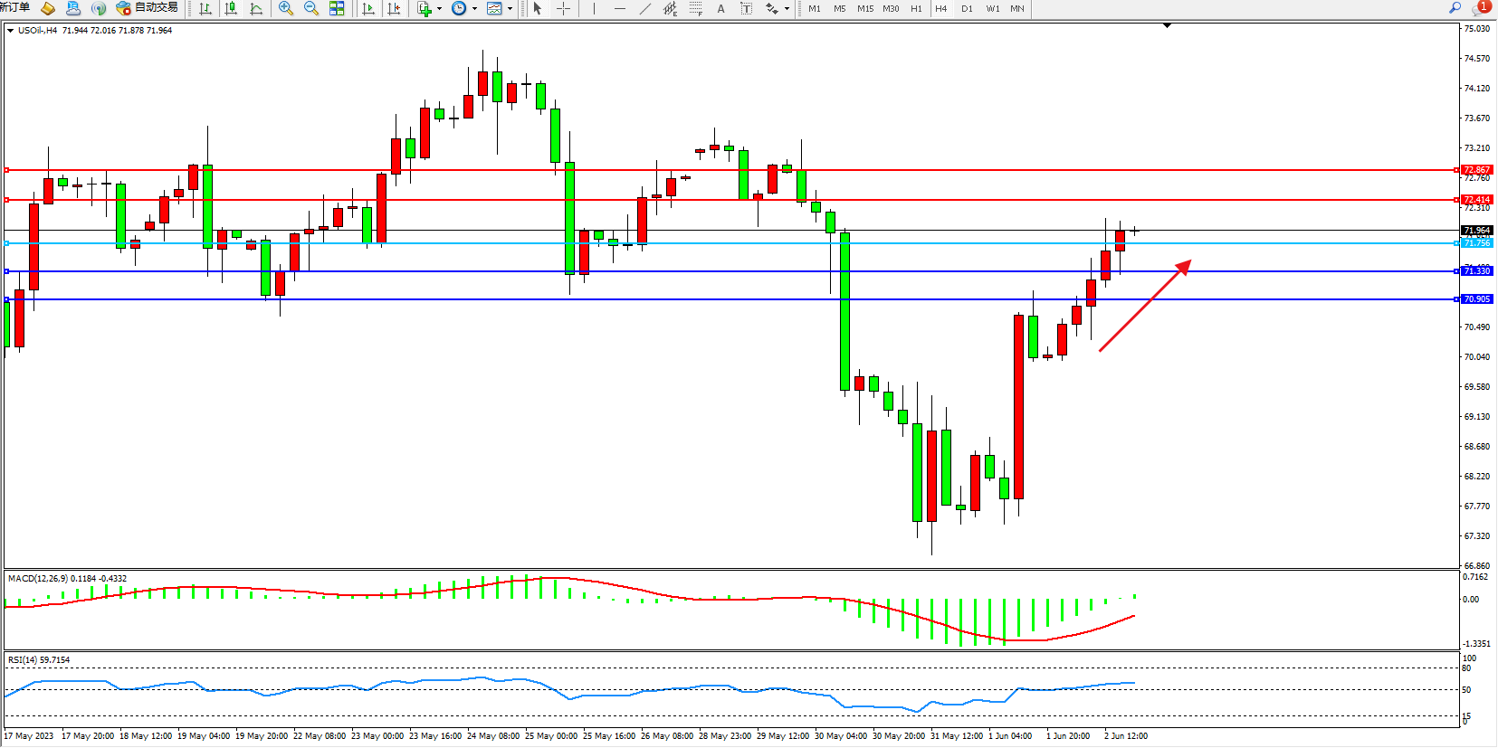 原油维持71.964附近震荡,美联储6月份加息预期降温,美元隔夜大跌,也给油价提供支撑,油价隔夜大涨后,短线看涨信号有所增加,短线存在进一步反弹机会。