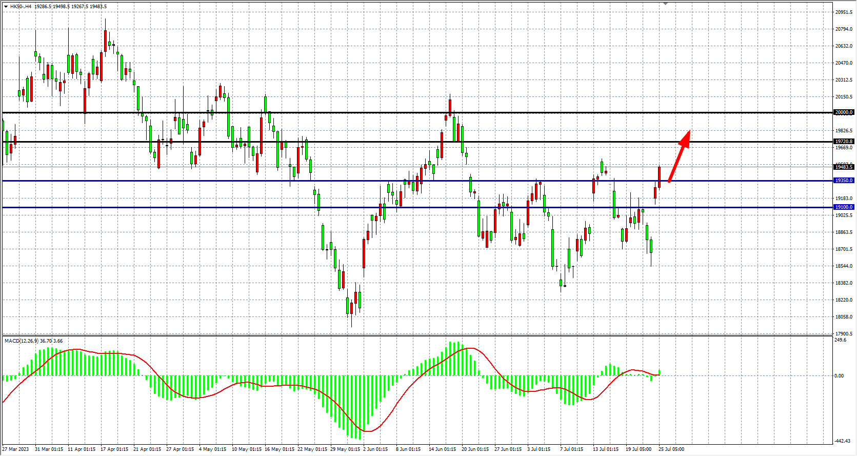 4小时图看,恒指进一步突破19350,MACD量能在零轴附近盘整,支撑关注19300关口,上方目标看19720-20000。