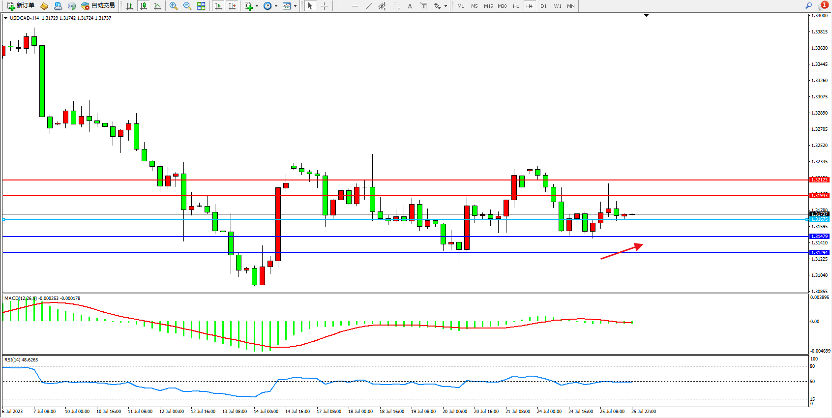 美元加元USDCAD——4小时K线图显示: