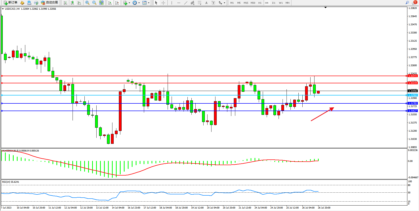 美元加元USDCAD——4小时K线图显示: