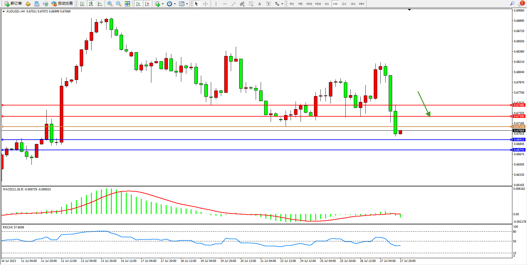 交易策略:0.67130下方看跌,目标0.66913 0.66743