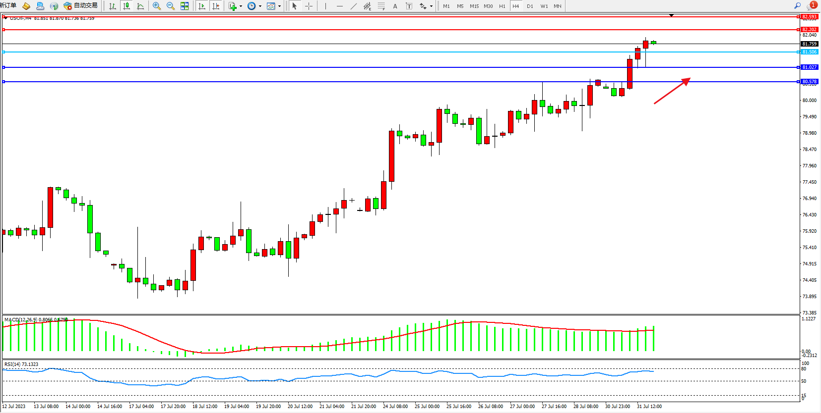 原油USOil——4小时K线图显示: