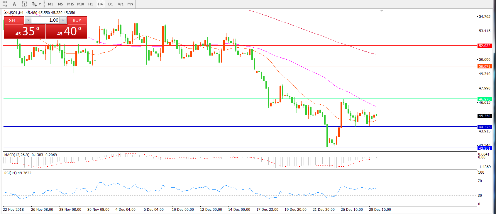 4小时图看,油价触及42美金后出现反弹,突破44美元后暂时企稳,但均线系统仍呈空头排列,MACD绿柱缩短,短期走势以震荡偏空思路对待。