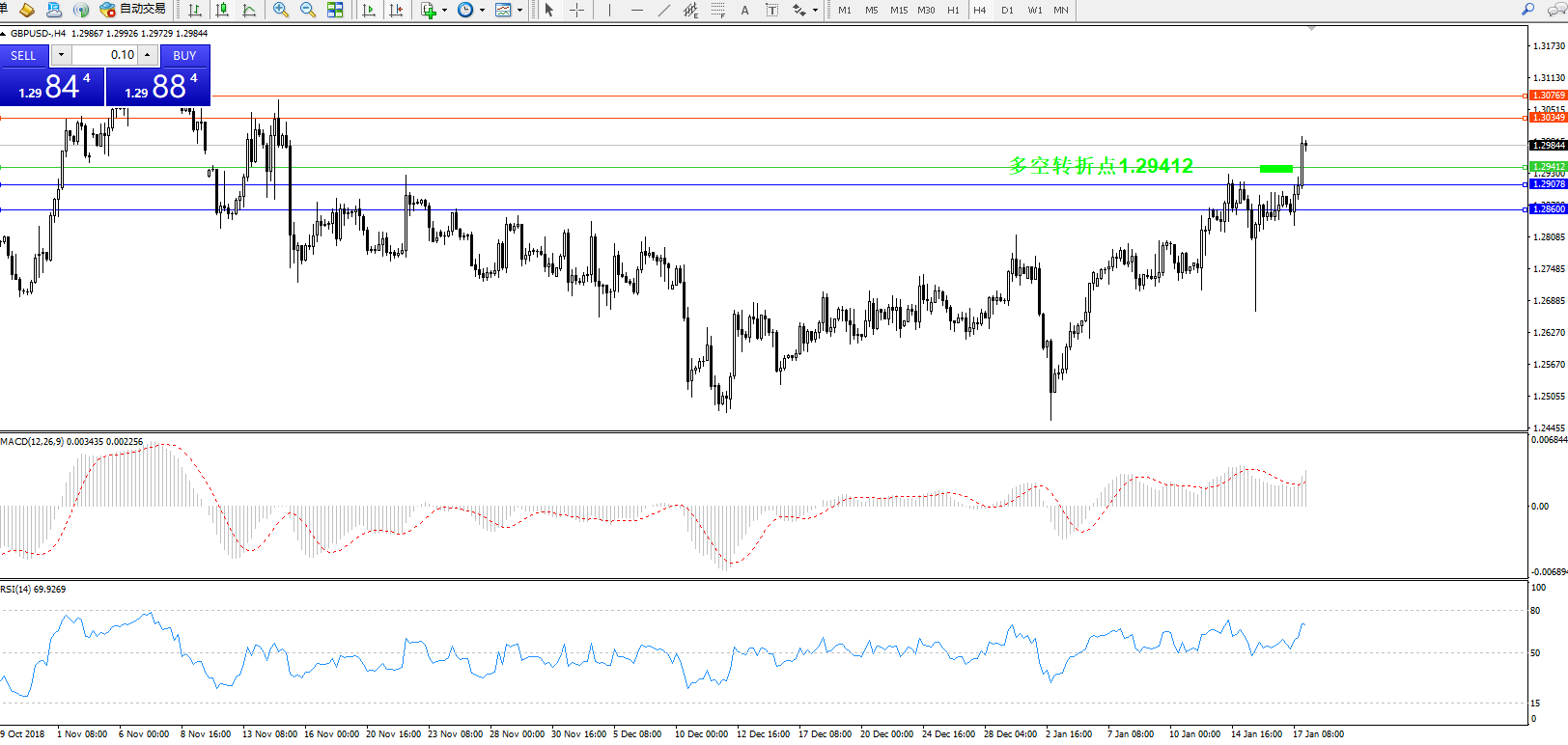 交易策略:1.29412上方看涨,目标1.303491.30769