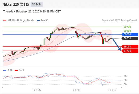 在 59060 之下,看跌,目标价位为 58050 ,然后为 57700 。