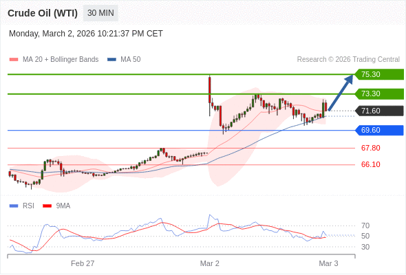 在 69.60 之上,看涨,目标价位为 73.30 ,然后为 75.30 。