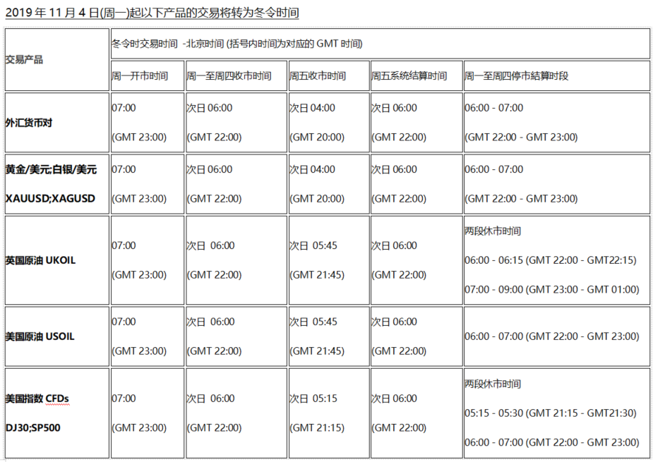 欧洲时区将于2019年10月28日(周一)及美国时区将于2019年11月4日(周一)开始分别转为冬令时交易时间。