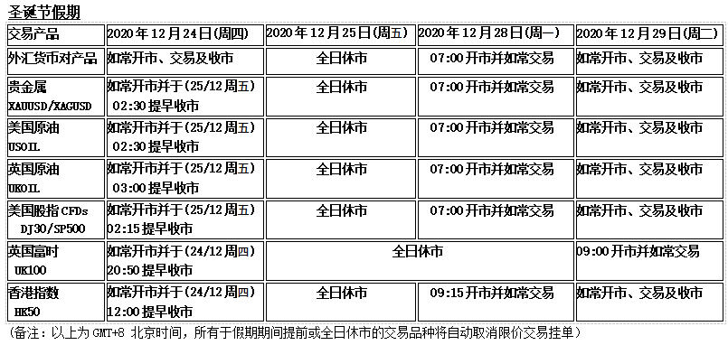 因应各地市场圣诞节假期及元旦新年假期影响,以下产品的交易时间将于假期期间提早和全日休市,敬请阁下留意知悉!