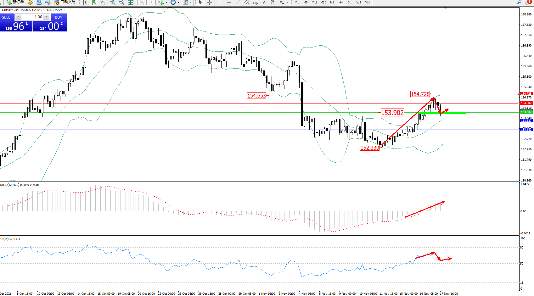 备选策略:153.902下方看跌,目标153.527、153.122