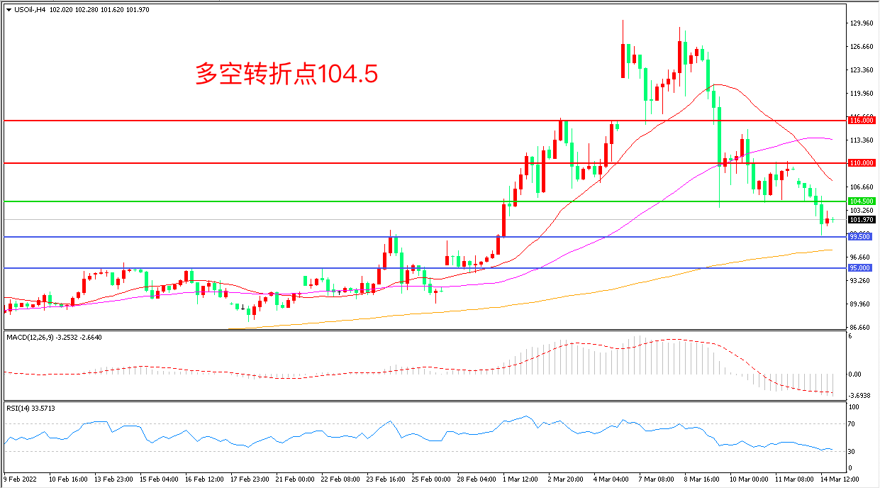 周一(3月14日),俄乌第四轮谈判开始,俄乌双方均积极表达了各自的立场,和平曙光的出现对油价形成打压,美国WTI原油大幅下挫,收报101.97美元/桶。考虑到政治博弈的不确定性,投资者仍需对战争威胁保持警惕,伊核谈判暂停的情况下,重点关注后续西方国家对俄罗斯能源的制裁情况。