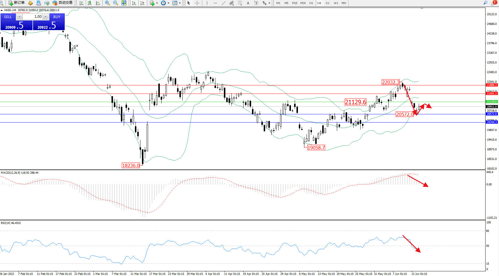 恒指HK50 ——4小时K线图显示: