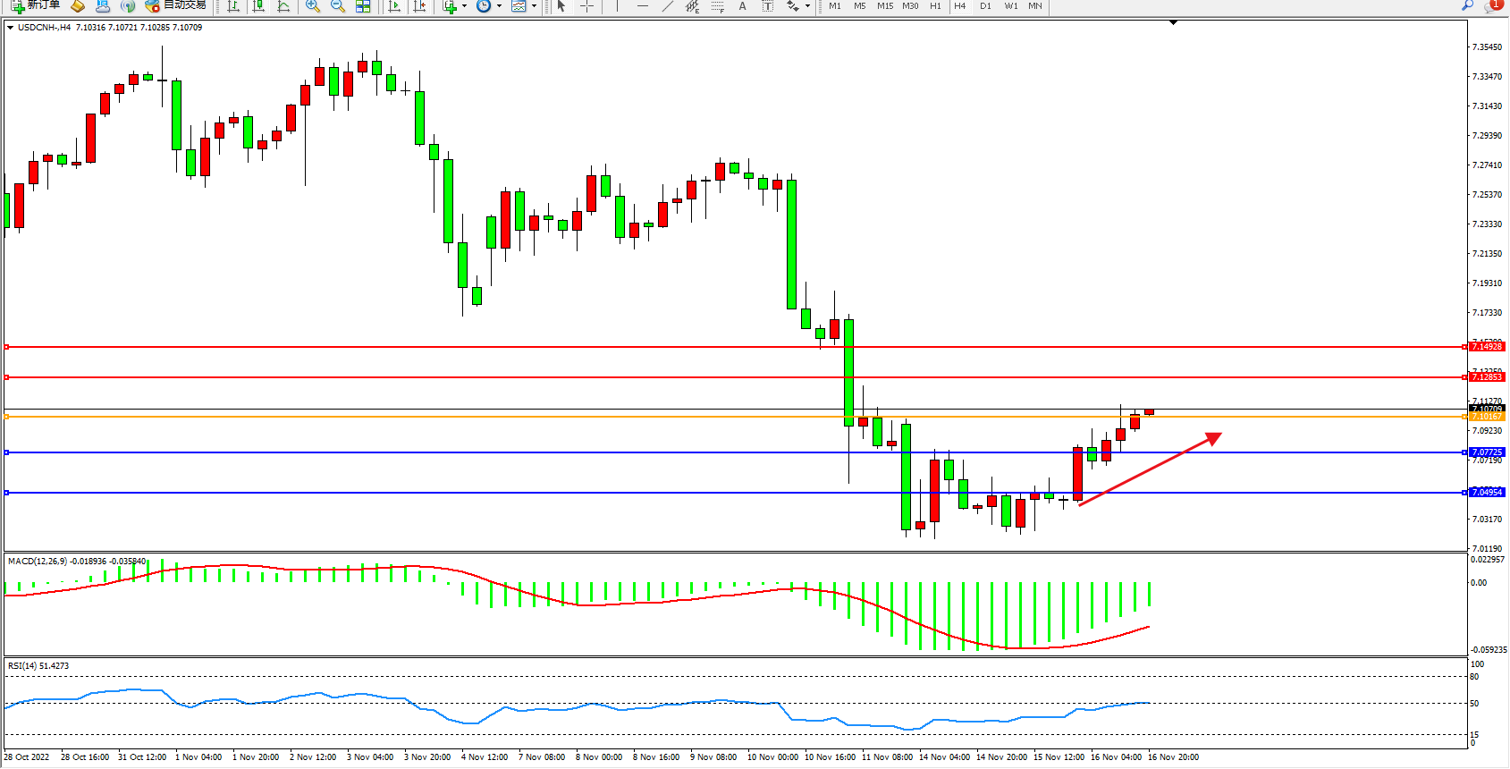 美元人民币USDCNH——4小时K线图显示: