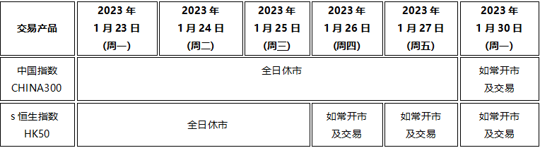 因应2023年1月21日至1月27日期间为国内及香港农历新年假期,本公司以下产品的交易时间将于假期期间作以下安排,敬请留意。