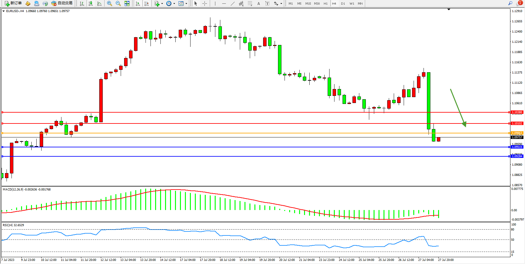 欧元美元EURUSD—4小时K线图显示: