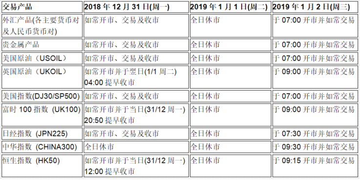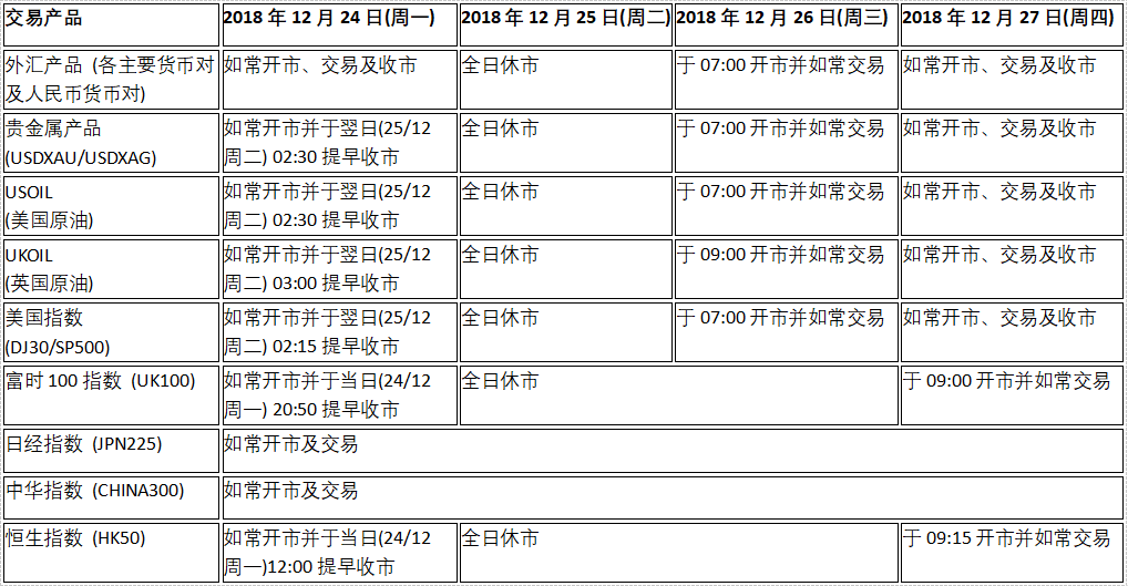 由于世界各地交易市场圣诞节假期及新年假期影响,以下产品的交易时间将于2018年12月24日(周一)至12月27日(周四)及2018年12月31日(周一)至2019年1月2日(周三)假期期间有所调整,敬请留意!