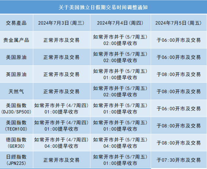 关于美国独立日假期交易时间调整通知